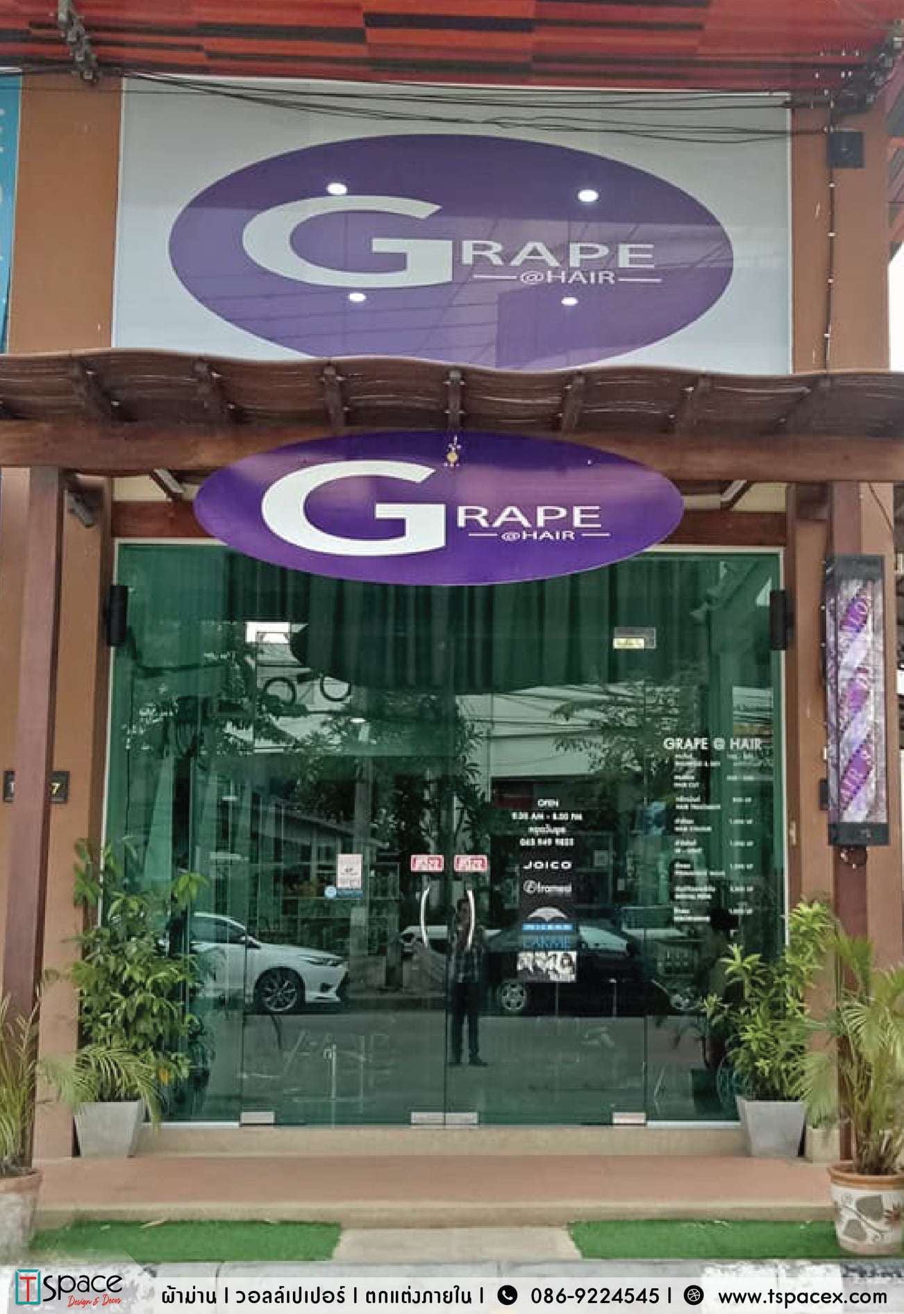 การเลือกใช้ผ้าม่านสีม่วงเป็นเอกลักษณ์เฉพาะตัวของร้าน Grape Hair สะท้อนถึงความเป็นตัวของเจ้าของร้านที่ชื่อ “องุ่น” ซึ่งเป็นที่มาของชื่อร้าน ผ้าม่านสีม่วงจึงเป็นเหมือนลายเซ็นที่บ่งบอกความเป็นเอกลักษณ์ของร้านได้อย่างชัดเจน